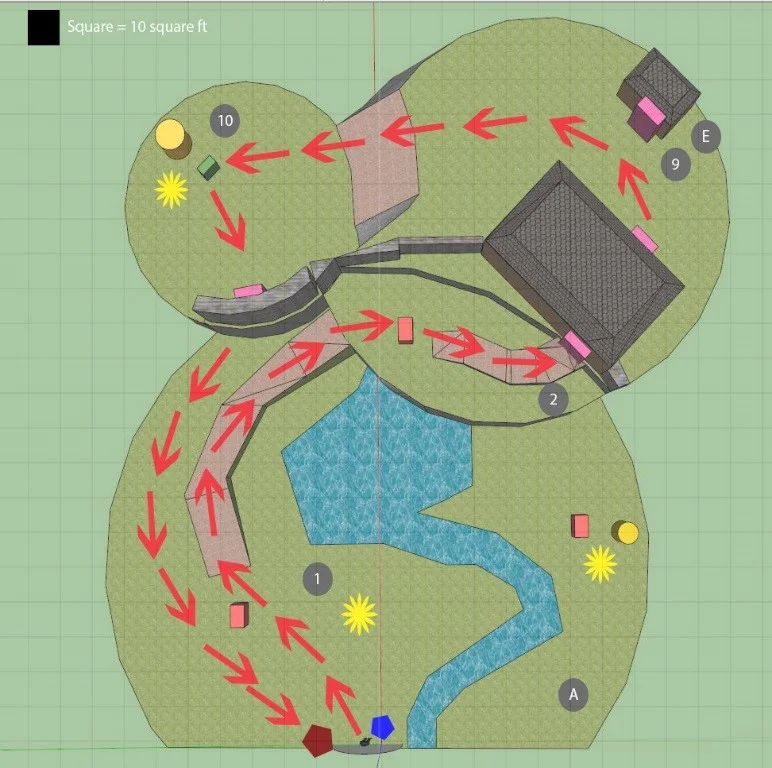 This screenshot captures a view of my level’s haunting cave interior, Whispering Springs Cavern. Capturing the correct tone and atmosphere in this space is vital. This cave is the first area players enter after starting “Honey We Shrunk the Dovahkiin!” When the player enters the space, the moving line of falling water draws the player’s eye up the cliff face to the house perched on the cliff, the player’s final goal. Overall, I am very pleased with the lighting and structure of this space as they create an environment reminiscent of a massive catacomb.