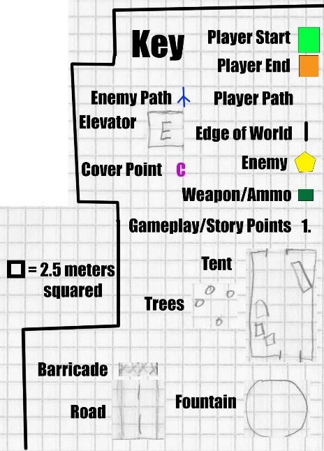 This image depicts the previously fortified central evacuation area within the park. It serves as a miniature arena for a battle against one of the campaign’s tougher enemies, the Heavy. The layout of this space served the gameplay very nicely, but posed some design challenges. To create this space, I had to imagine at least four stages of conflict that affected the area. It started as a peaceful park, changed to an evacuation center, fell victim to the destruction of New York, and was re-established as a refugee camp. Overall, I think that I only hit 2 and a half of the stages in the final product.